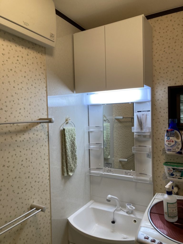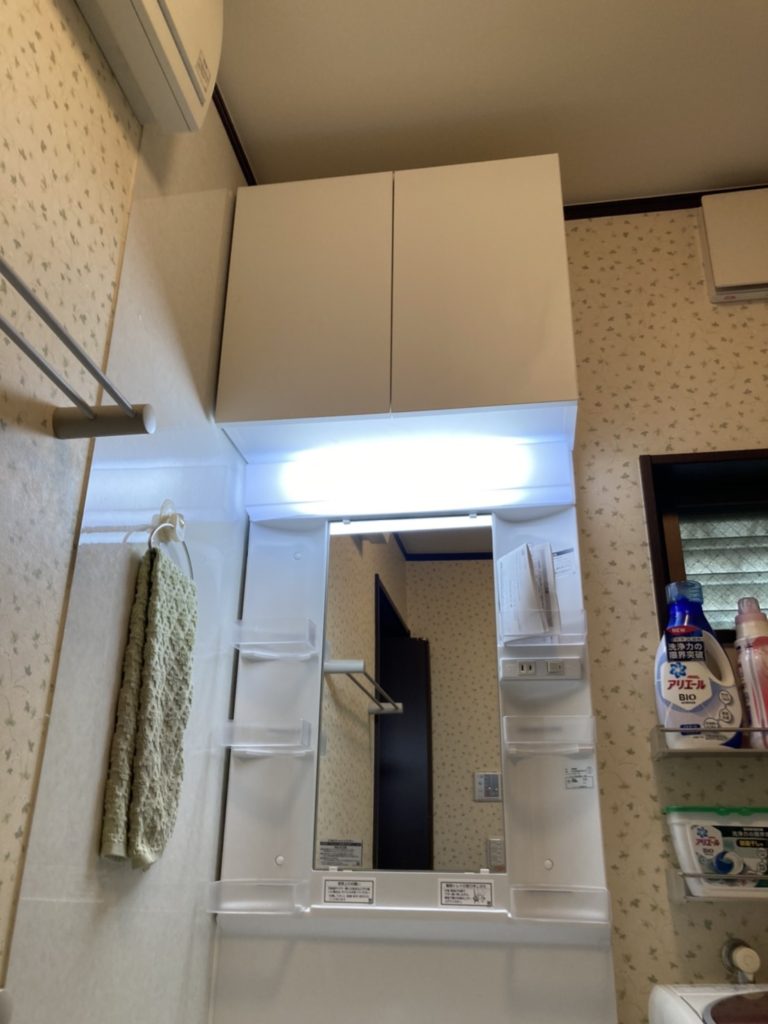 洗面化粧台の上に吊戸棚を設置しました。